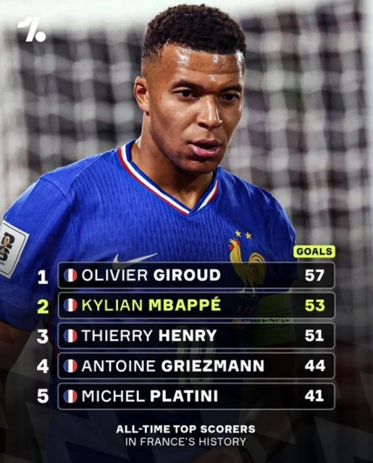 领先,姆巴佩有可能高出吉鲁,成为法国国度队的历史最好弓手。现在,姆巴佩依然攻入53球,吉鲁则有57球。对阵阿塞拜疆的比赛中姆巴佩再次进球,看起来他很可能在明夏天下杯之前就终了这一目的。