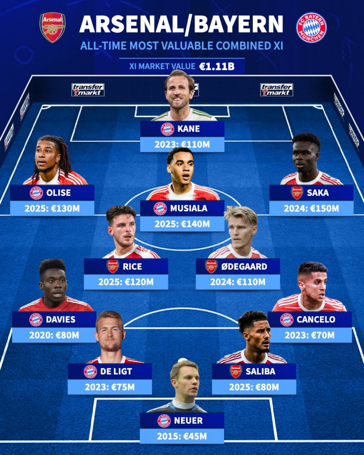 阿森纳+拜仁历史身价最高声势(取球员德转最高身价):