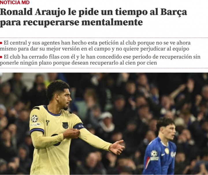 12月01日讯 据《寰宇体育报》最新音讯,在欧冠对阵切尔西时领到红牌之后,巴萨中卫阿劳霍向俱乐部恳求了一段心情复原假期。