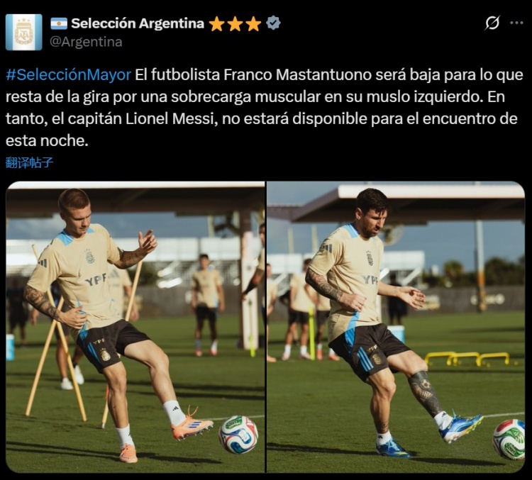 阿根廷官方写说念:“球员马斯坦托诺的左大腿肌肉过度疲劳,将缺席接下来的巡回比赛。与此同期,队长梅西也将缺席今晚的比赛。”