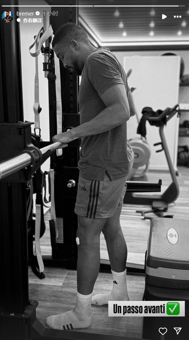 布雷默社媒晒图:身处健身房,正在进行规复性测验。相片的右下角配特意大利语笔墨“Un passo avanti”,意为“上前一步”。