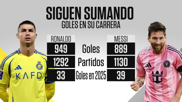C罗糊口1292场949球,梅西1130场889球。2025年梅西打入39球,C罗33球。