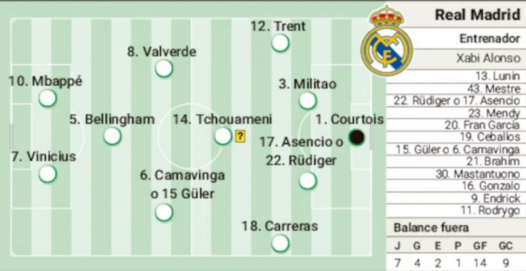 中场:巴尔韦德、琼阿梅尼、贝林厄姆、卡马文加/居莱尔