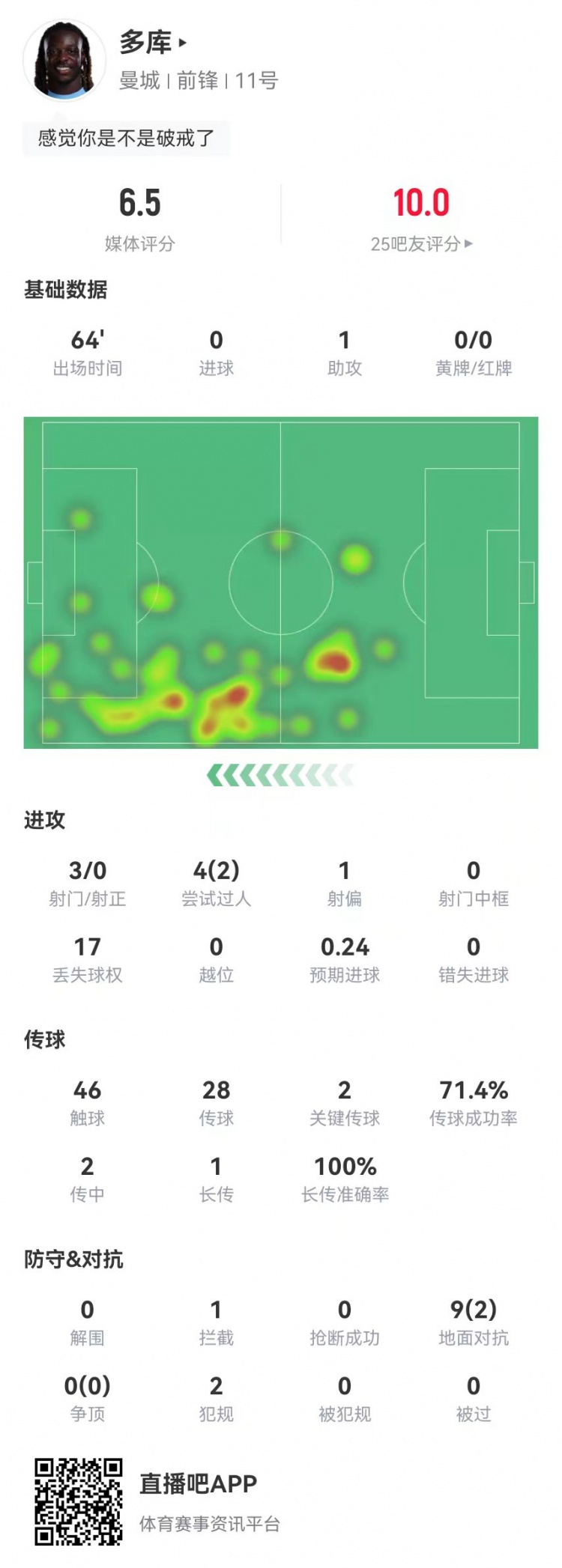12月3日讯 曼城在本轮英超客战富勒姆,多库进球被改手脚乌龙。他本场数据如下: