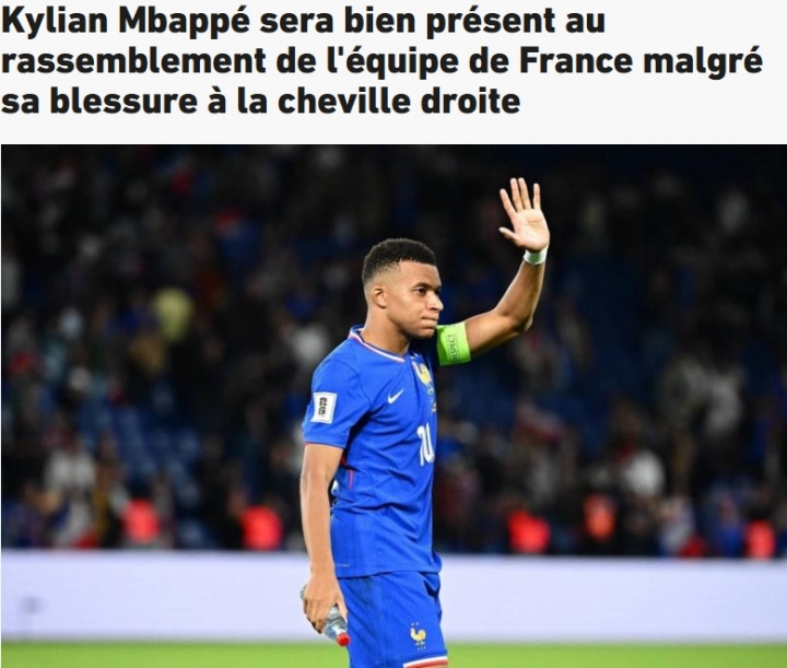 姆巴佩在对阵黄潜的比赛中破门,但下半场扭伤脚踝被换下。《队报》指出,姆巴佩在赛前就已稍许扭伤的合并部位,这次扭伤又轻飘加剧了他的伤情。
