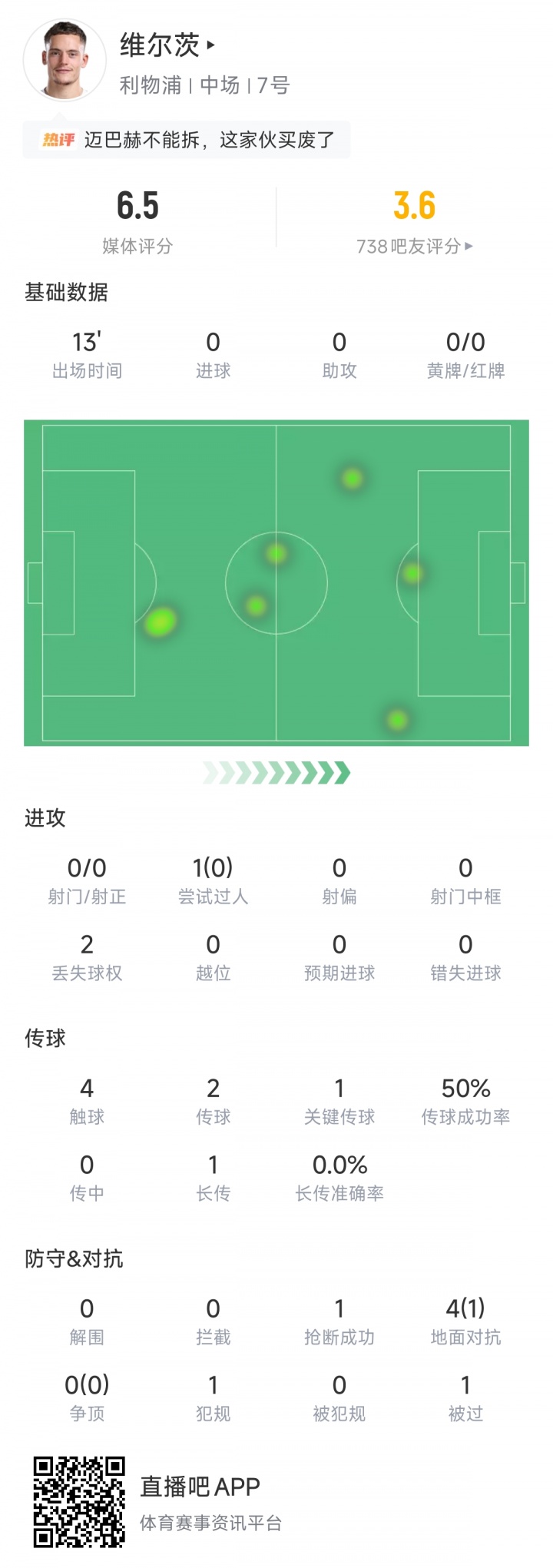 从第77分钟出场到伤停补时第4分钟为止,维尔茨一共出战17分钟,盘算4次触球2丢球权,1次长传1次穿裆被过,4次回击1见效。具体数据如下: