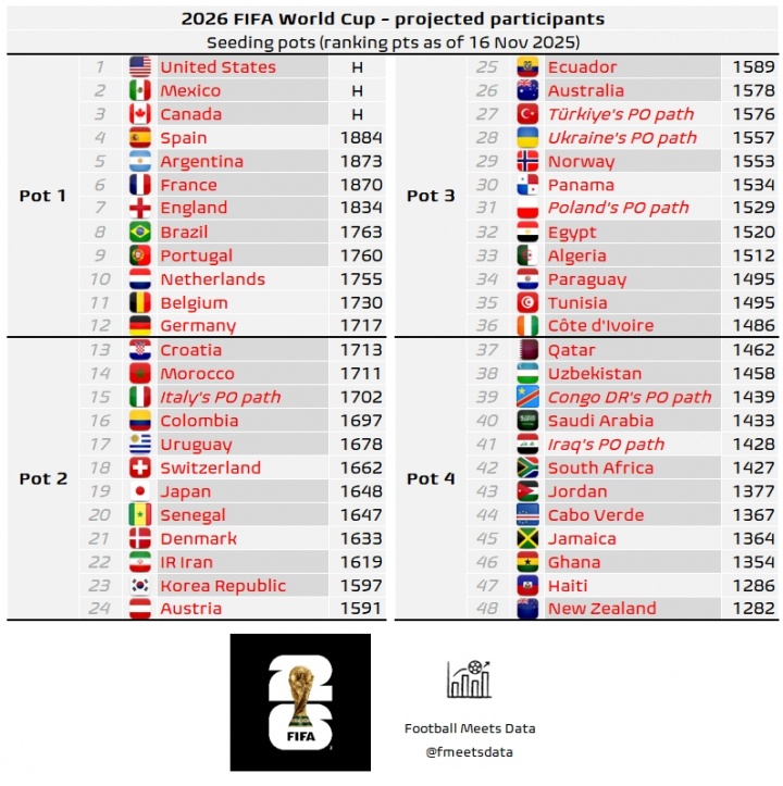 11月17日讯 世初赛激战正酣,当今天下杯48支参赛队已笃信32席,数据机构Football Meets Data笔据现存天下排行给出了最新的天下杯分档瞻望。