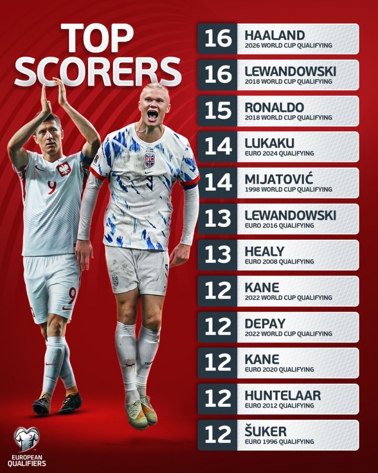 11月18日讯 欧足联男足国度队官方社媒账号列单届(世初赛欧洲区/欧洲杯预选赛)进球榜,本届世初赛的哈兰德以及2018世初赛的莱万以16球比肩第一。