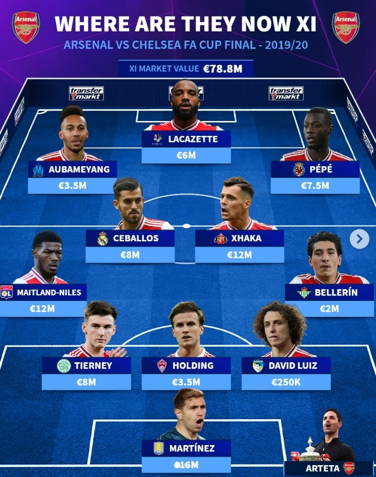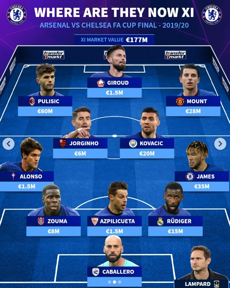 11月30日讯 本轮英超焦点战阿森纳对阵切尔西行将打响,德转清点了两支球队在19/20赛季足总杯决赛(阿森纳2-1取胜夺冠)对阵时首发东说念主员去处,两队仅剩里斯-詹姆斯仍在队中,具体如下: