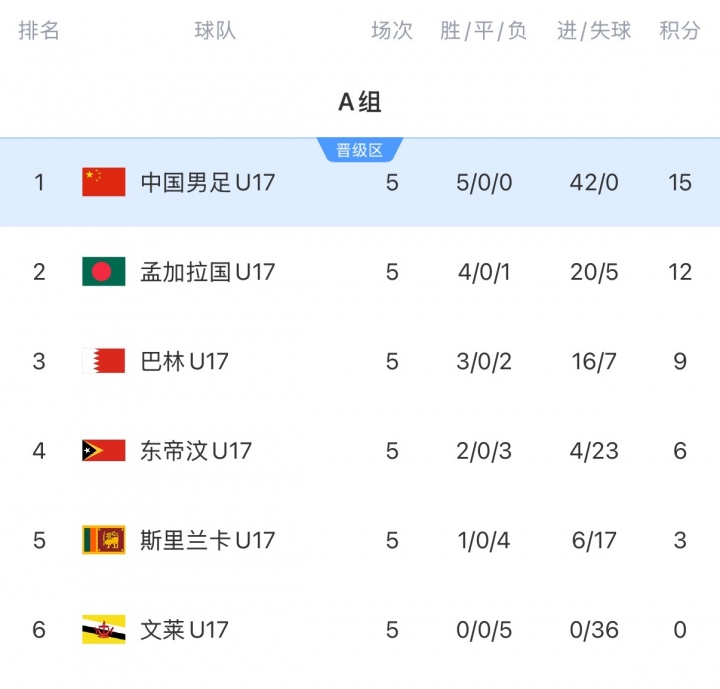 11月30日讯 当天U17亚初赛临了一轮,U16国足4-0投诚孟加拉国,5轮全胜领跑积分榜,成效晋级来岁U17亚洲杯。最终积分榜如图。