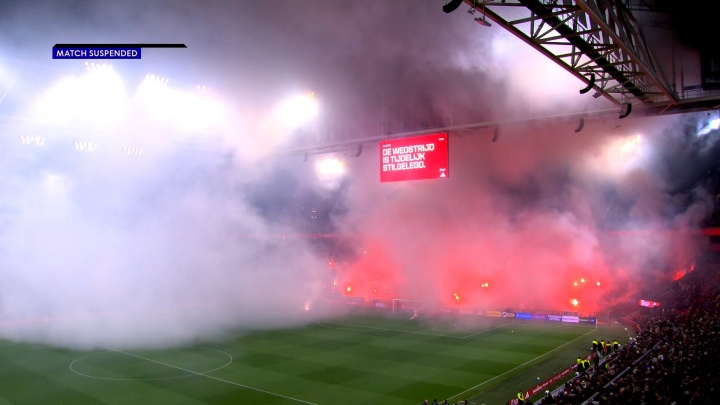 阿贾克斯与格罗宁根的比赛在今晚仅进行了五分钟。由于死忠球迷看台(球门后方)燃放了无数烟花,球员们其时不得不驱驰着离开球场。