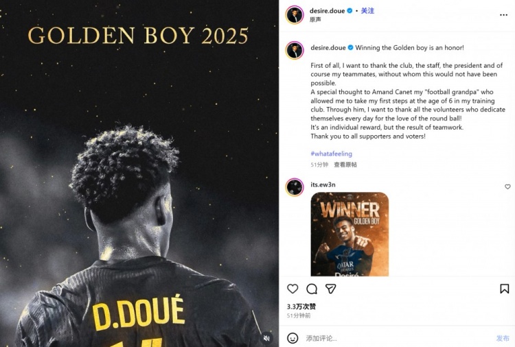 “这是个东谈主的荣誉,亦然团队配合的后果。感谢悉数球迷们和投票者!”