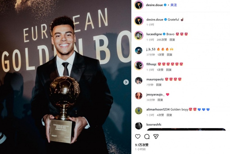 12月3日讯 在《齐灵体育报》垄断的欧洲金童奖授奖庆典上,杜埃领取了2025年金童奖杯。