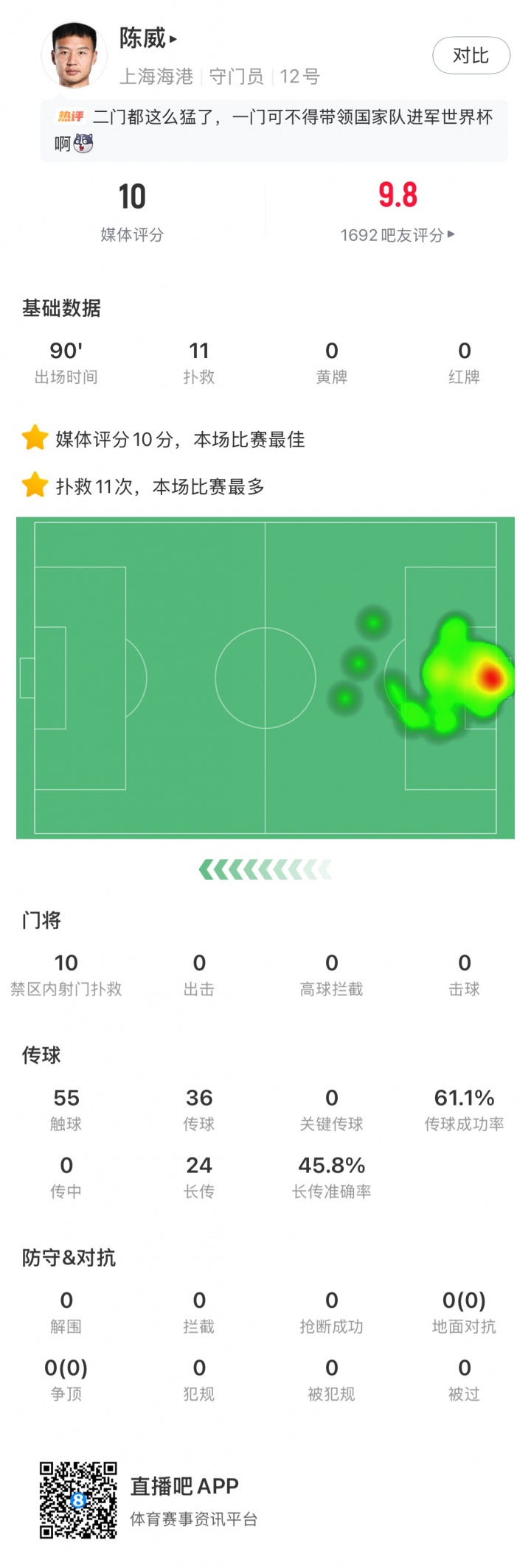 海港门将陈威本场数据:11次扑救,55次触球36次传球。媒体评分10分!