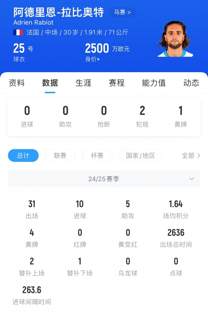 拉比奥特现年30岁,昨年从尤文解放转会至马赛,上赛季为马赛出场31次,孝顺10球5助攻,现身价2500万欧,他与马赛的协议至来岁到期。