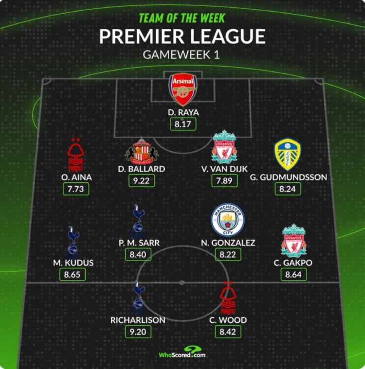 8月19日讯 本赛季英超首轮战罢,数据网站Whoscored也评比出本轮英超最好气势,拉亚、加克波、理查利森等在列,具体如下: