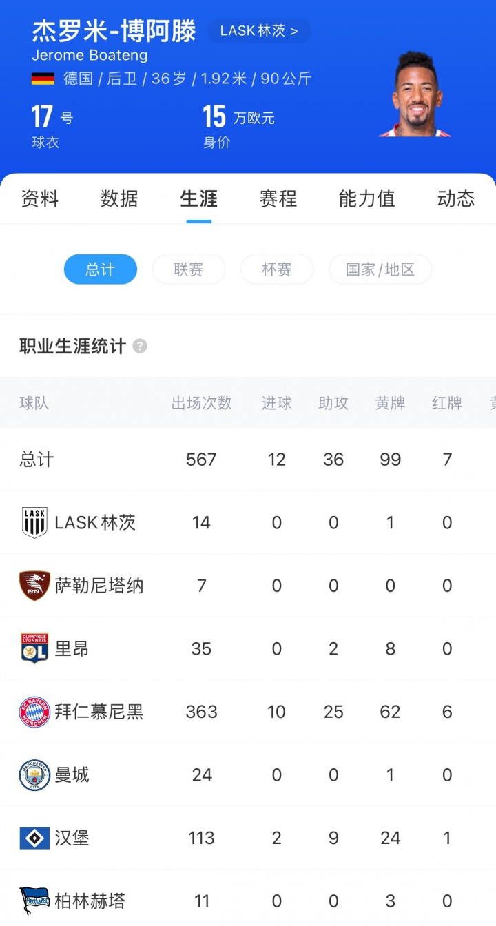 36岁的博阿滕上赛季为林茨出场14次,野心444分钟,他咫尺的身价为15万欧。