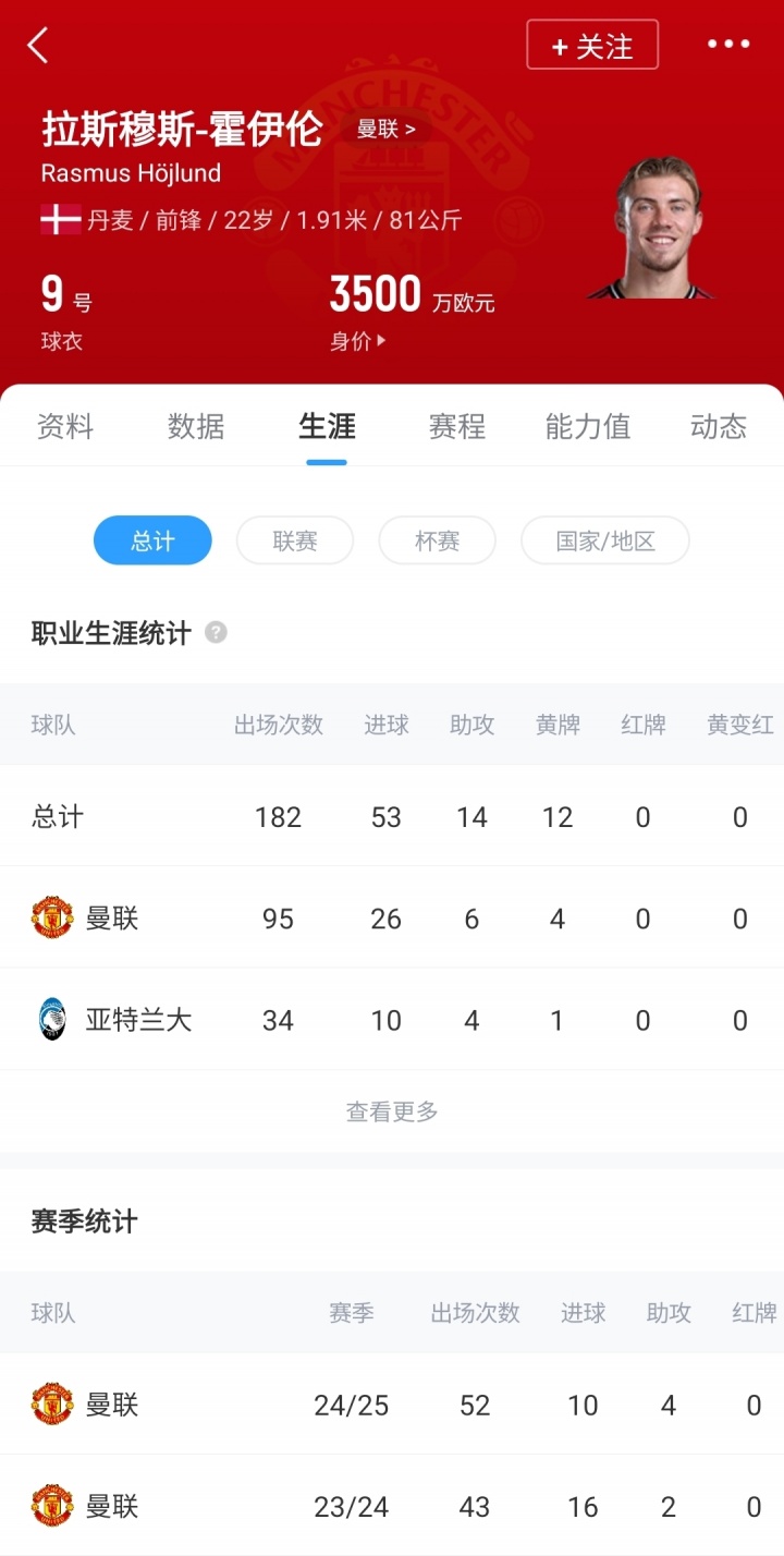霍伊伦现年22岁,曼联2023年夏天耗尽7780万欧从亚特兰大引进霍伊伦。在曼联的两个赛季,霍伊伦共代表球队出战95场比赛,孝敬26球6助攻。现在,霍伊伦的德回身价为3500万欧。