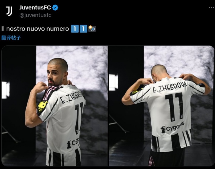 尤文臣推也通过社媒晒出热格罗瓦的亮相照,并细则他将身披11号球衣:“咱们的新11号!”