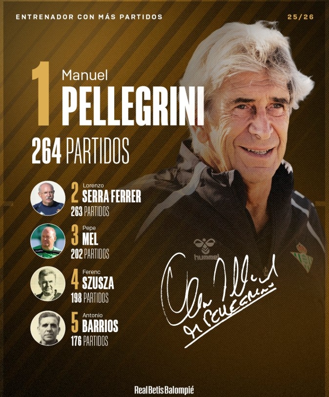9月29日讯 西甲第7轮比赛,贝蒂斯在主场迎战奥萨苏纳,佩莱格里尼迎来我方抓教贝蒂斯的第264场比赛,这让他特出洛伦佐-塞拉-费雷尔成贝蒂斯队史抓教场次最多的主莳植。