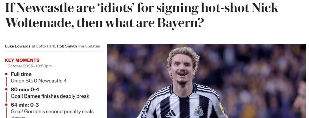 虎扑10月02日讯在4-0打败圣吉罗斯不息的欧冠赛后,纽卡斯尔多位跟队记者撰写专栏著述,反讽拜仁。