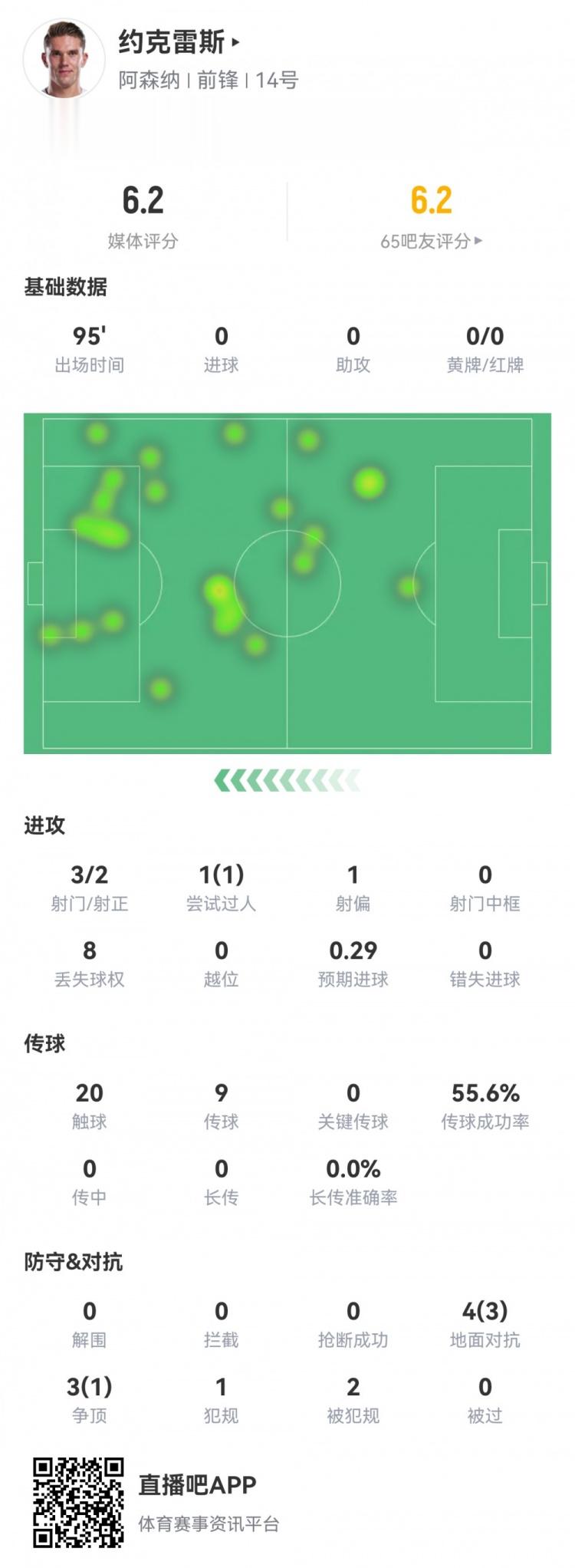 直播吧10月19日讯本轮英超,阿森纳1-0客胜富勒姆。此役约克雷斯首发95分钟被换下,球员全场要点数据如下↓