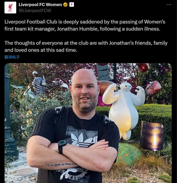 利物浦官方对此发表声明:“利物浦足球俱乐部关于利物浦女足装备惩处员乔纳森·汉布尔突发疾病可怜离世,深感恐慌与悲悼。在这个悲伤的时刻,俱乐部举座成员与乔纳森的家东说念主与一又友同在。”