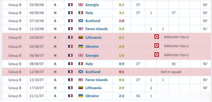 好事成双,当亨利在巴萨渐入佳境时,他在国家队也是喜讯不断。07年10月17日欧洲杯比赛资格赛法国队本场比赛对阵立陶宛队的比赛,亨利在比赛尾声阶段完成梅开二度,帮助法国队2:0击败对手。这两粒射门计分数也让亨利以43球超越普拉蒂尼的41球,独占了法国队史第一射门射门计分手的宝座。这次资格赛亨利为法国队打进了6球,是队内第一射门射门计分手,似乎亨利成功扛起了后齐达内时代法国队的大旗。