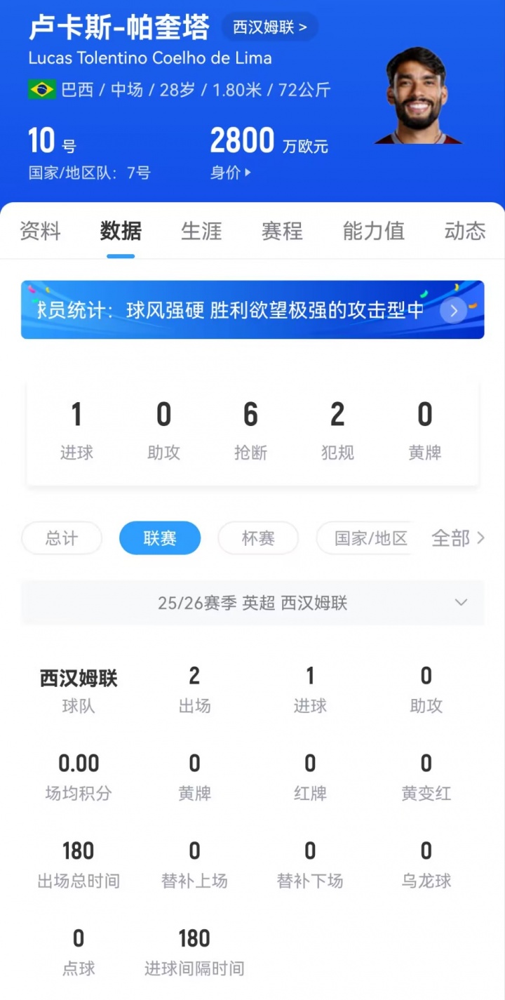 现年28岁的帕奎塔本赛季为西汉姆联出战了前两轮英超联赛,并在对切尔西的比赛中打入一粒天下波。