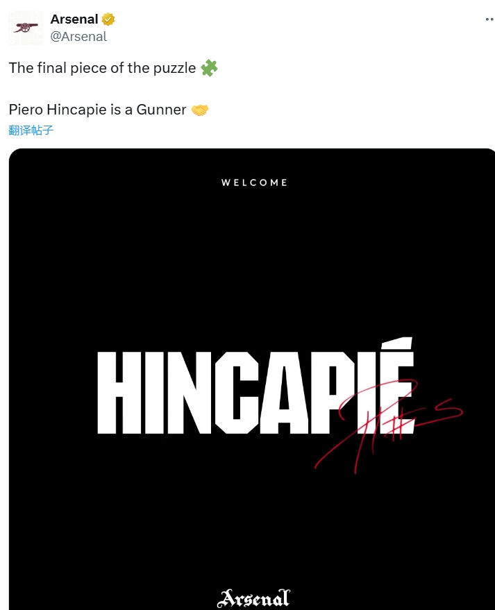 阿森纳的官宣案牍也相配有重量:终末一块拼图,因卡皮耶是枪手了!