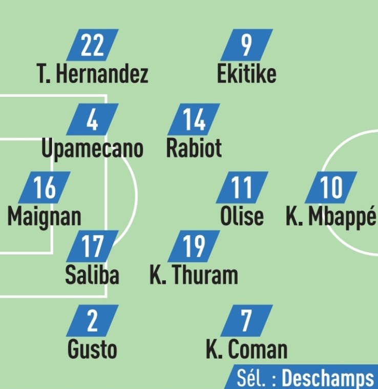 队报臆目标国队首发:迈尼昂;特奥、于帕梅卡诺、萨利巴、古斯托;拉比奥特、K-图拉姆、埃基蒂克、奥利塞、科曼;姆巴佩