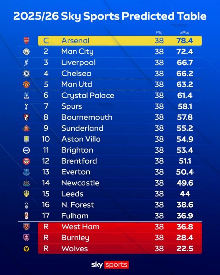天外体育展望本赛季英超最终名次(积分为模拟10万次的平均值)